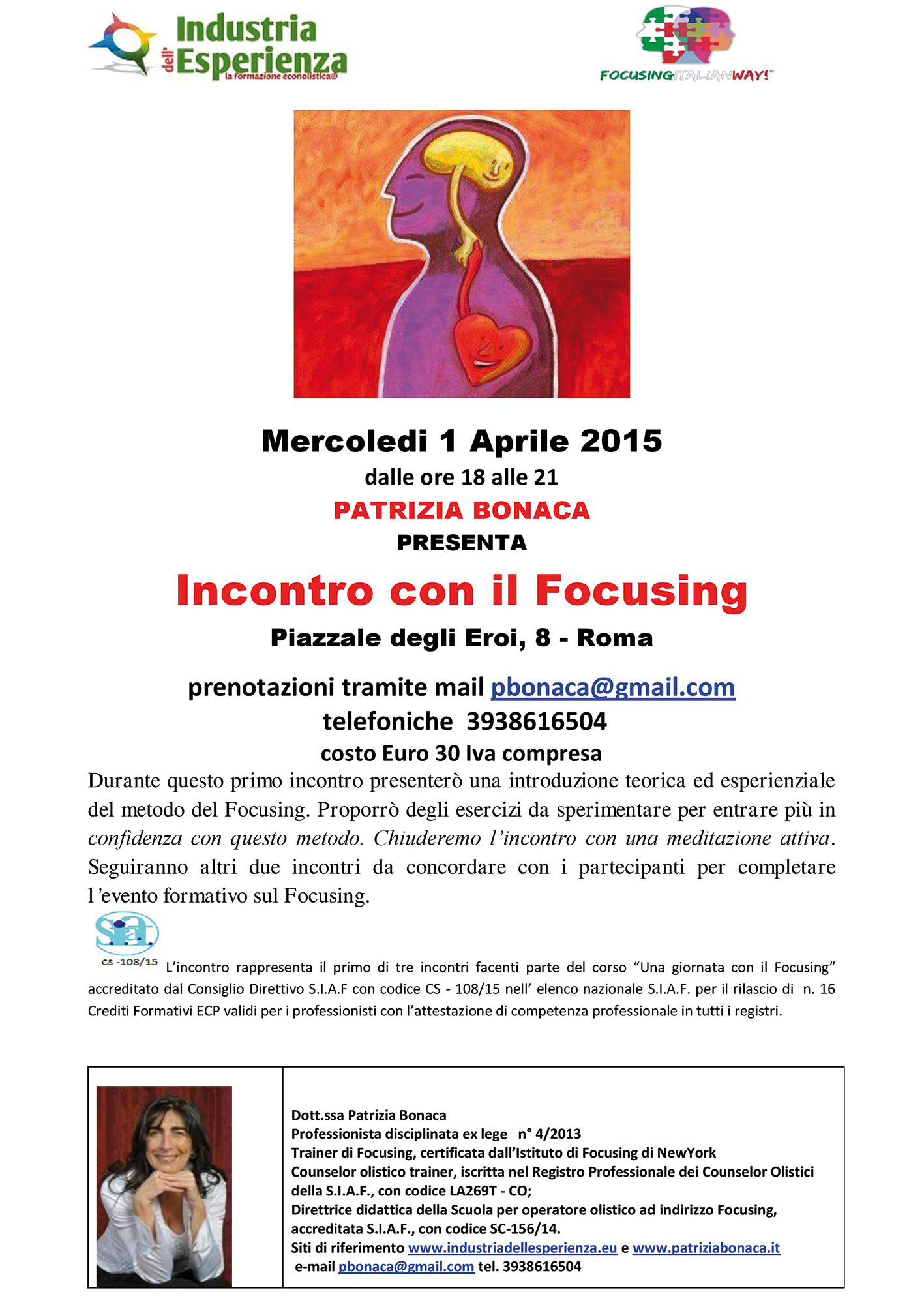 Siete in: Home » PATRIZIA BONACA PRESENTA: INCONTRO CON IL FOCUSING – 16 ECP » Eventi » PATRIZIA BONACA PRESENTA: INCONTRO CON IL FOCUSING – 16 ECP