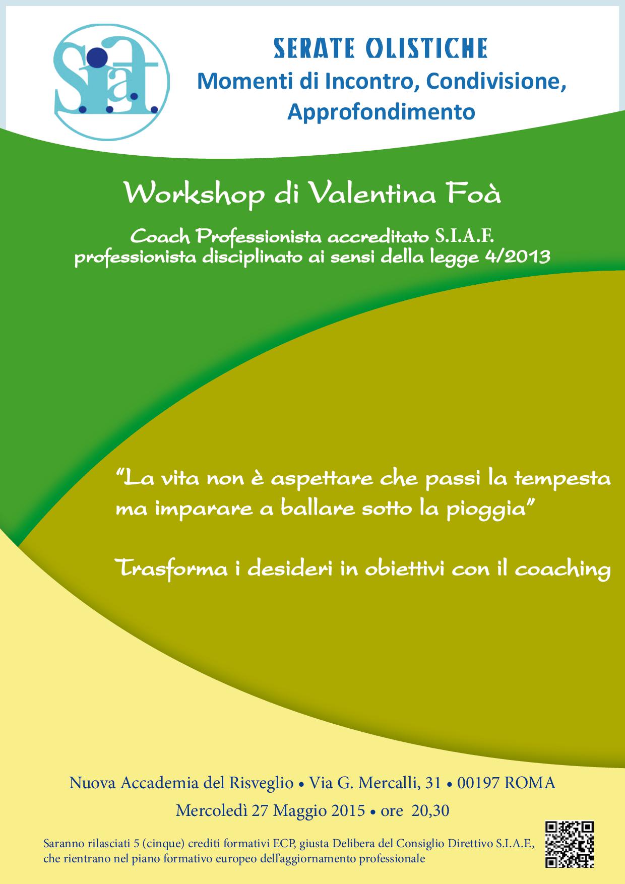 SERATA OLISTICA di VALENTINA FOA’: TRASFORMA I DESIDERI IN OBIETTIVI CON IL COACHING – 5 ECPPubblicato il 21 Maggio 2015